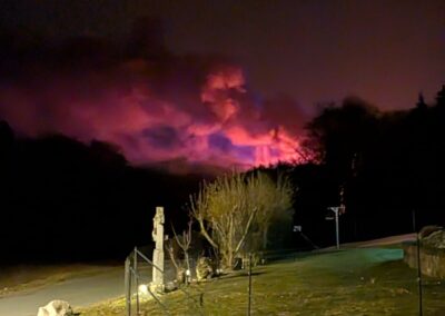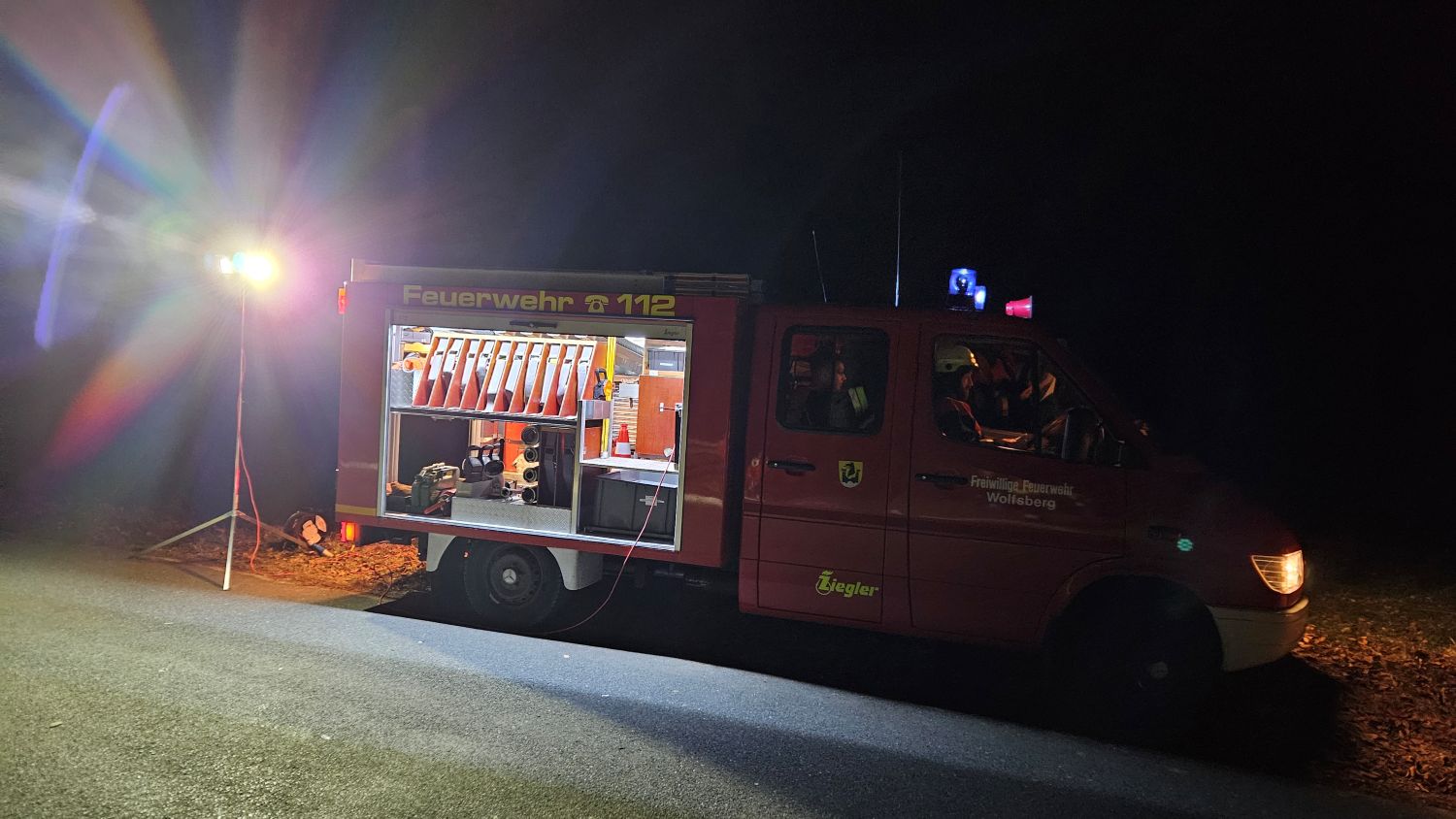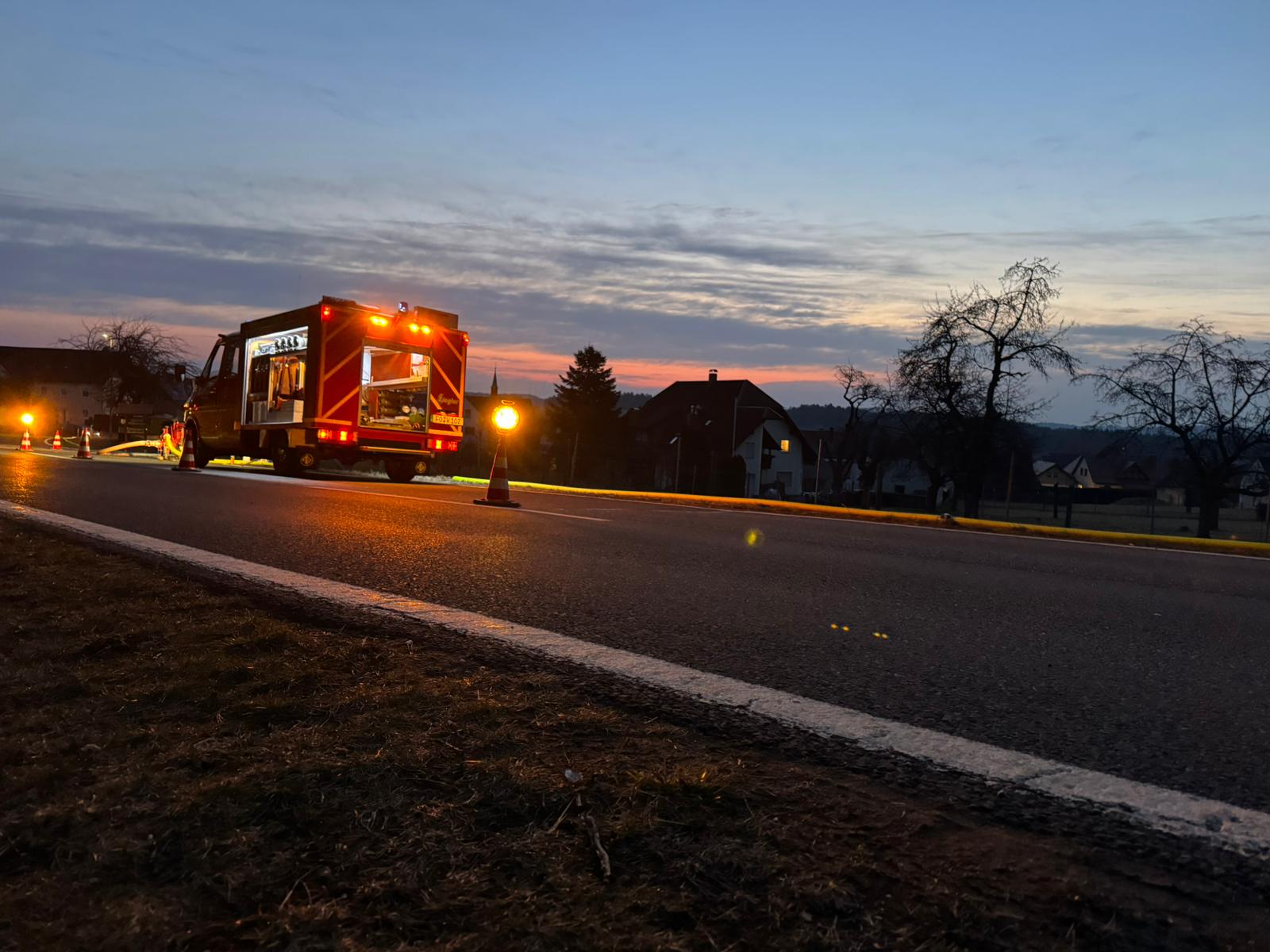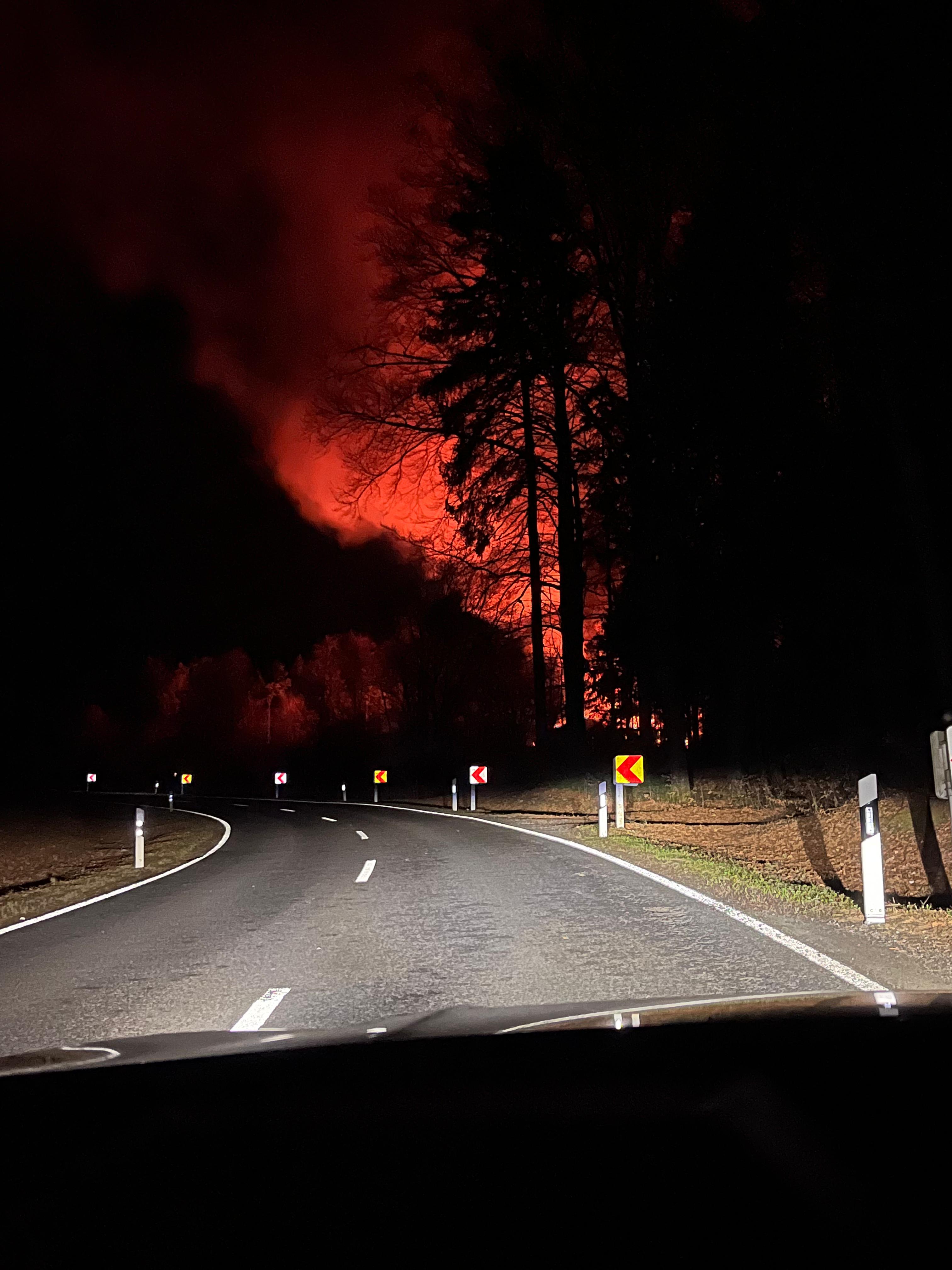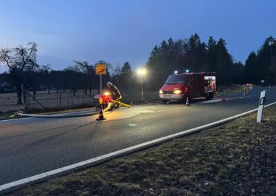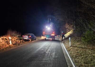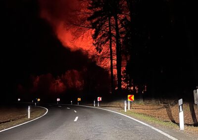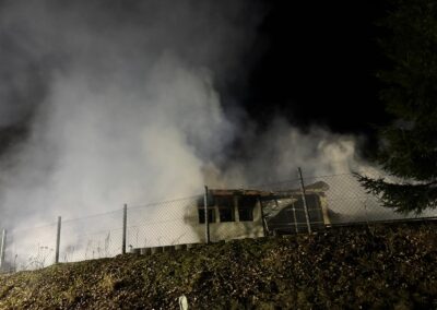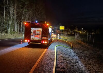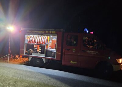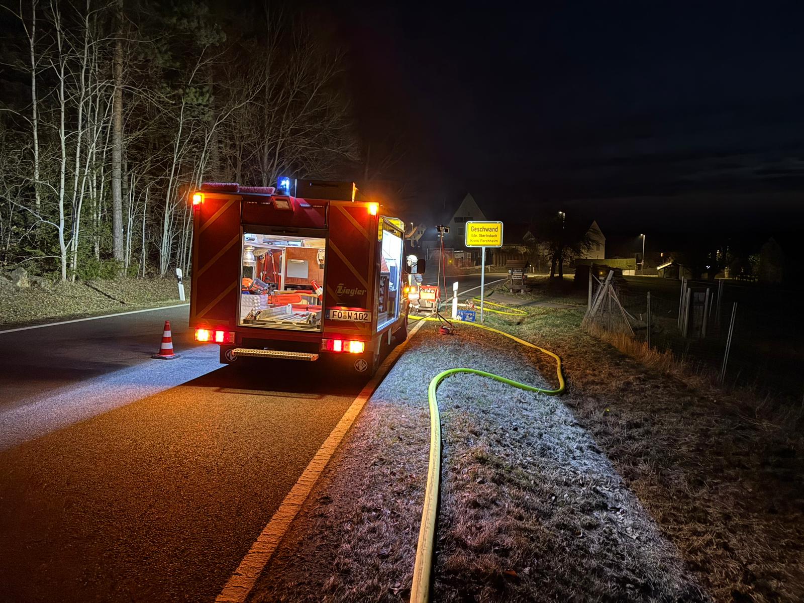 Am Sonntag, den 08.03.2026 ertönten im Umkreis verschiedene Sirenen. Unsere rief uns aber erst eine halbe Stunde später, um 22:42 Uhr, zum Gerätehaus. Zu diesem Zeitpunkt wussten wir bereits, dass der Aussiedlerhof bei Sorg lichterloh brannte. Aufgrund der späten Uhrzeit und auch weil das Auszählen der Kommunalwahl noch in vollem Gange war, trafen alle Aktiven sehr unterschiedlich ein, sodass der erste Teil mit dem TSF bereits Richtung Geschwand ausgerückt war und der zweite Teil Richtung Sorg fuhr.