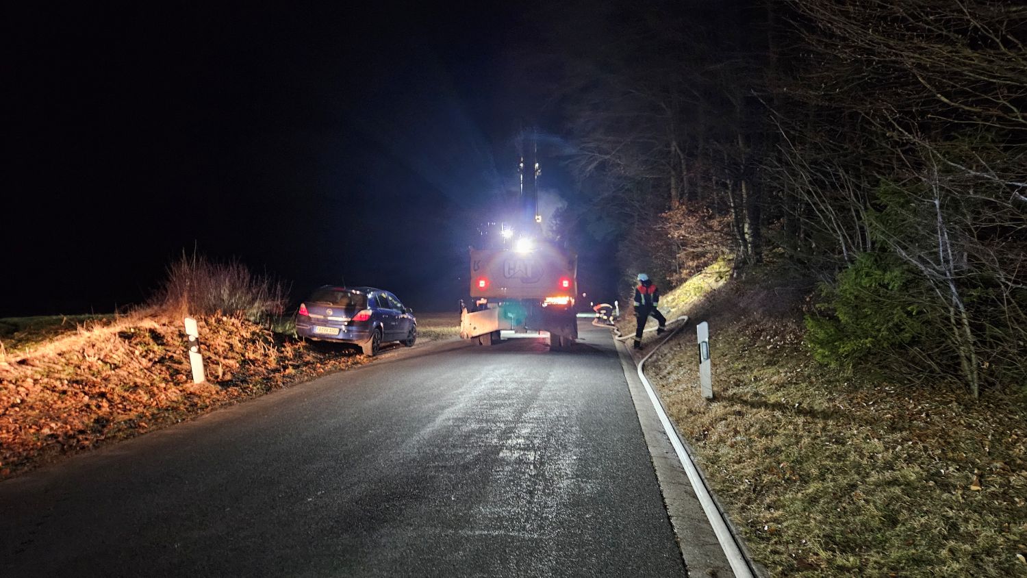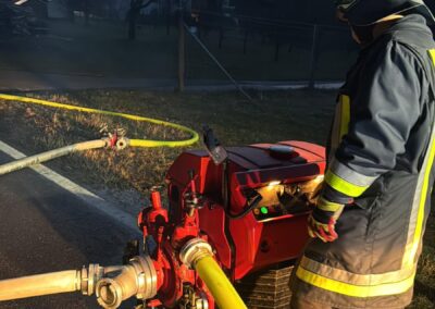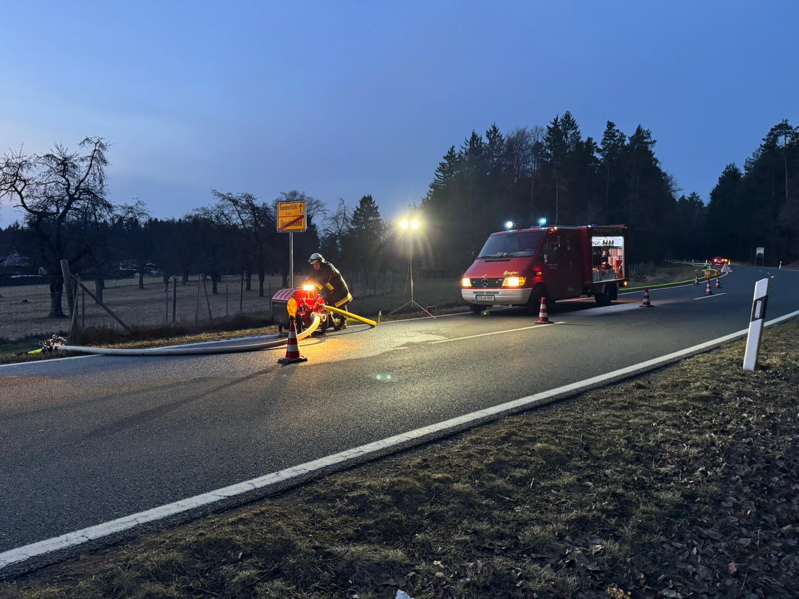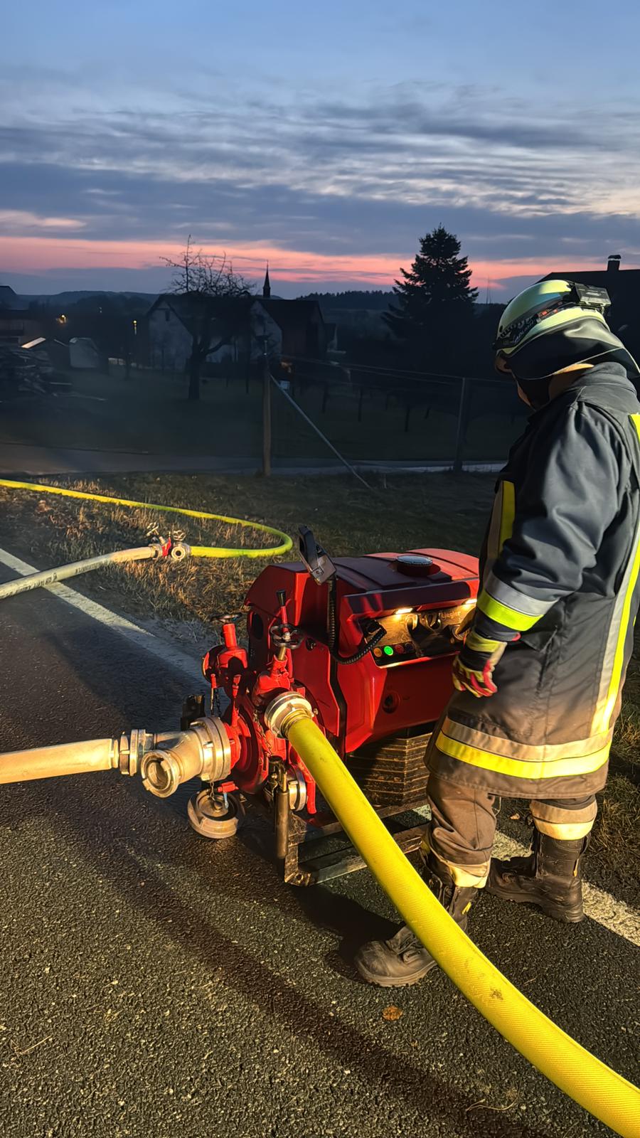Entsprechend wurde zum einen eine Löschwasserversorgung von Geschwand aus aufgebaut und zum anderen unterstützten wir die Kameraden der anderen Wehren beim Verlegen der B-Leitung vom Sorger Löschwasserbehälter aus. Dabei erwies es sich als äußerst schwierig genügend Schlauchmaterial und Pumpen bereitzustellen, sodass wir unsere Reserven im Gerätehaus komplett nachholten. Unser TSF änderte anschließend den Standort und wir hielten eine Pumpe in der Sorger Förderleitung vor. Während die anderen Wehren mit der Brandbekämpfung beschäftigt waren, wurden weitere Feuerwehren nachalarmiert, um eine Leitung vom Dörfleser Löschwasserbehälter aufzubauen, über die der Behälter in Sorg wieder befüllt wurde.