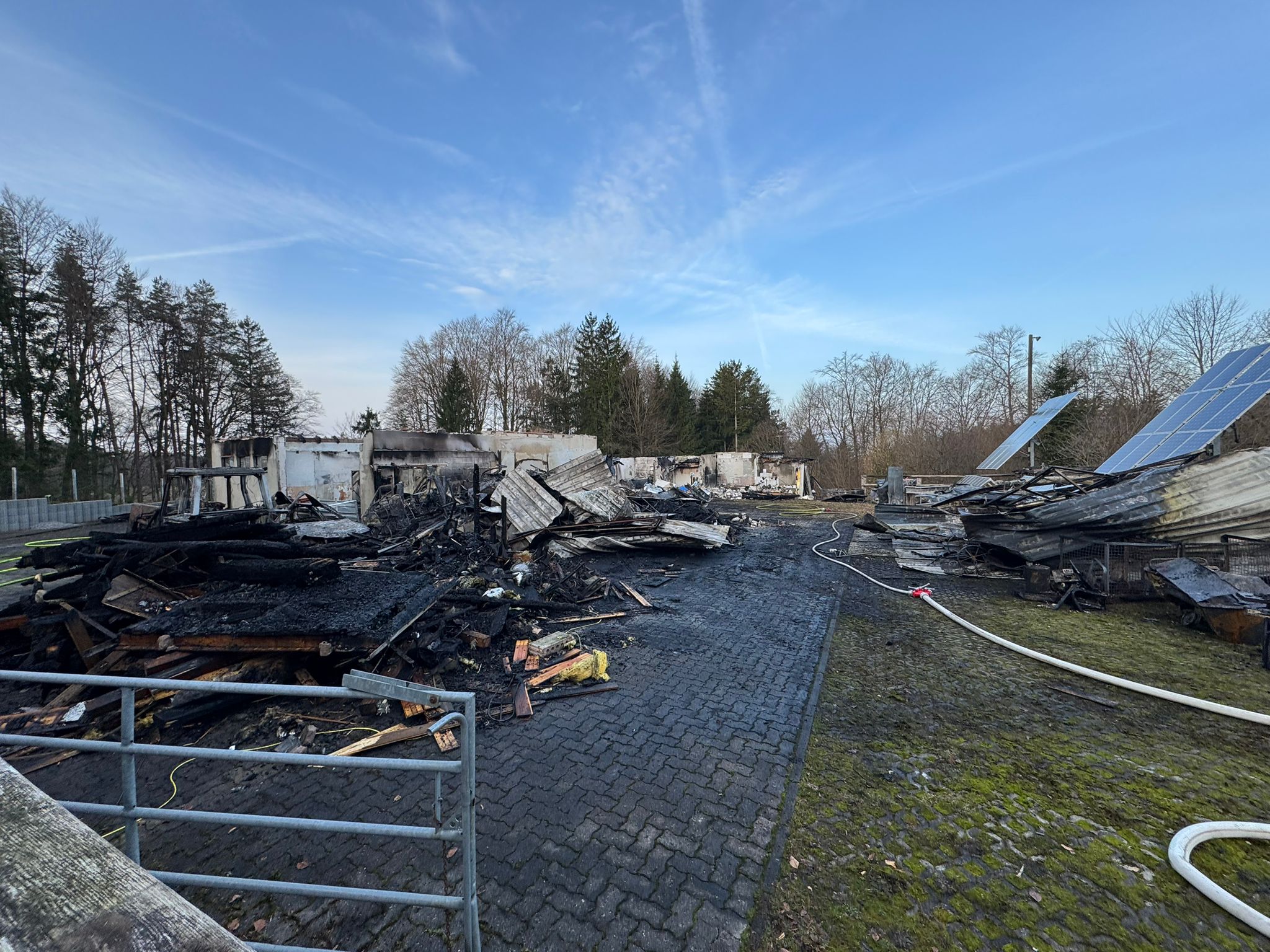 Nachdem der Brand im Wesentlichen unter Kontrolle war, wurden Teile unserer Wehr gegen 02:00 Uhr aus dem Einsatz gelöst; zumindest vorübergehend bis 04:30 Uhr. In dieser Zeit wurde ein Bagger angefordert, der die stehenden Gebäudeteile noch einriss, um die letzten Glutnester zu finden und zu beseitigen. Langsam aber sicher begann nun auch der Rückbau des Schlauchmaterials, das sich mittlerweile auf mehrere Kilometer erstreckte. Die wieder eingetroffenen Einatzkräfte lösten nach 05:00 Uhr das Thuisbrunner Löschgruppenfahrzeug aus und unterstützen anschließend bei den Aufräumarbeiten. Diese nahmen entsprechend viel Zeit in Anspruch, sodass erst gegen 08:00 Uhr am Montagmorgen die Einsatzstelle verlassen werden konnte. Zurück im eigenen Gerätehaus musste die Einsatzbereitschaft wiederhergestellt werden, sodass der Einsatz endgültig gegen 09:30 Uhr beendet werden konnte.